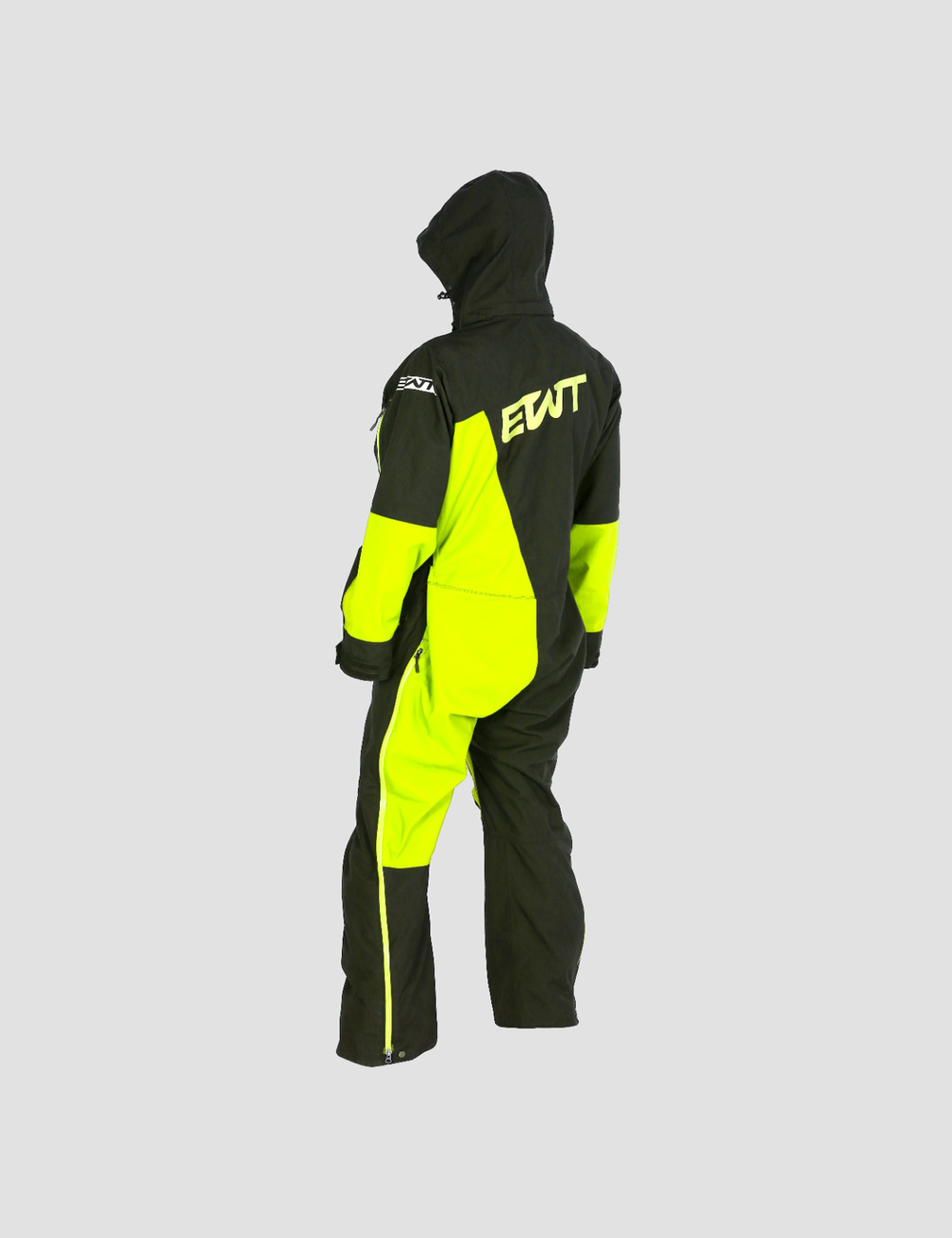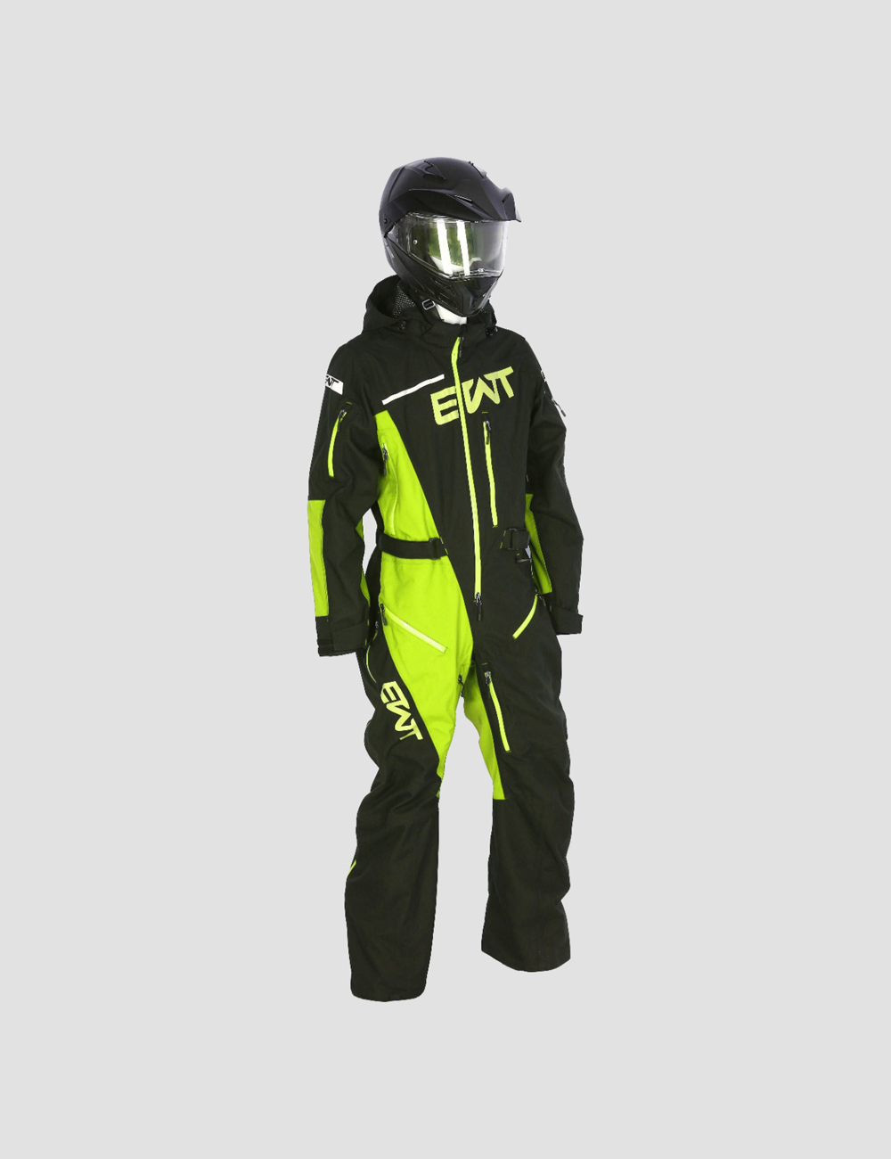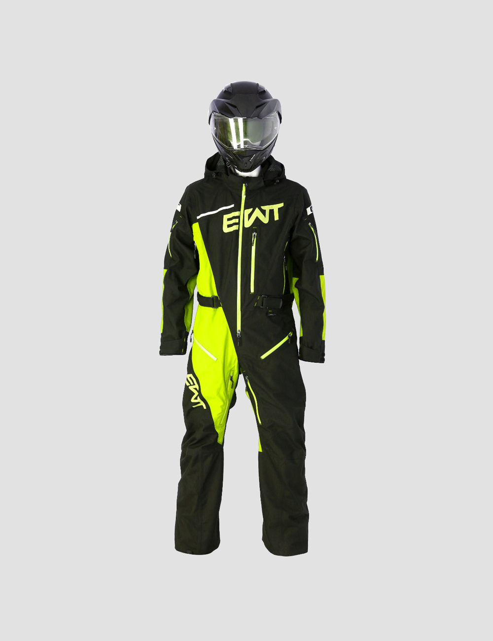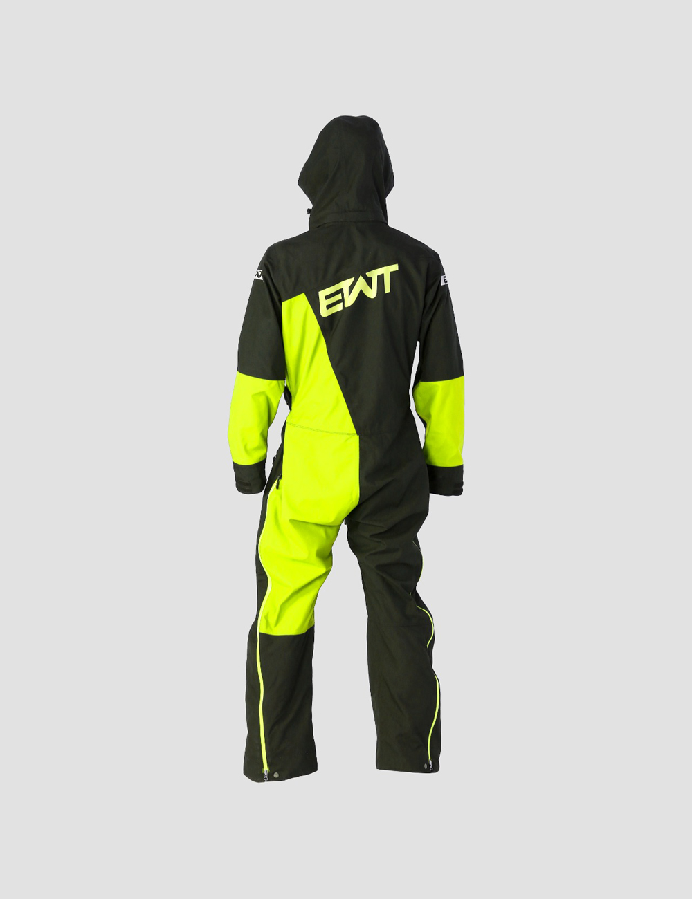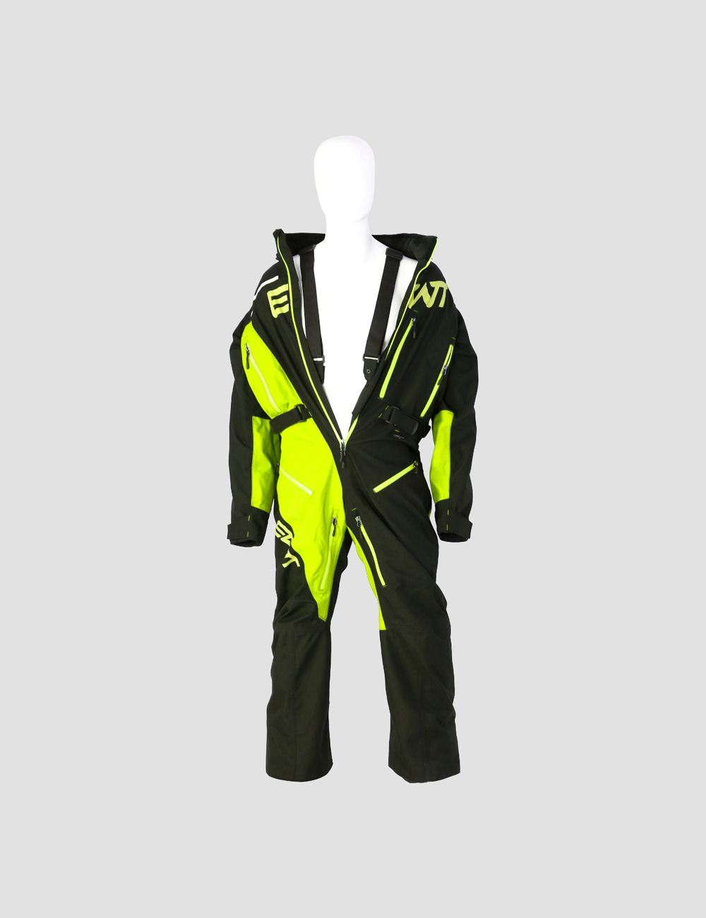 This Snowbike Fortis Suit is made from durable, three-layer, 30k 30k fabric. It has a removable hood with YKK water resistant aqua guard zippers. It has air vents with Snow Frog mesh at shoulder, legs, and under arm. Cuffs are also snow proof. Pockets are located on chest, left arm, and two at the pant. This suit has snow gators at the ankle with Velcro and snaps. There is also a side adjustment with belt. All seams are sealed with a heavy duty tape. Lining is in black mesh. Colors are fully customizable and Removable Suspenders.