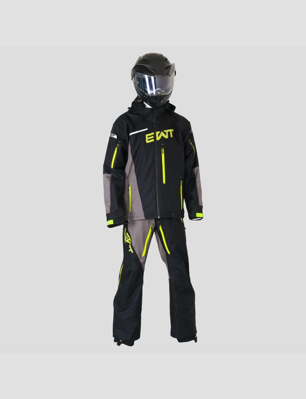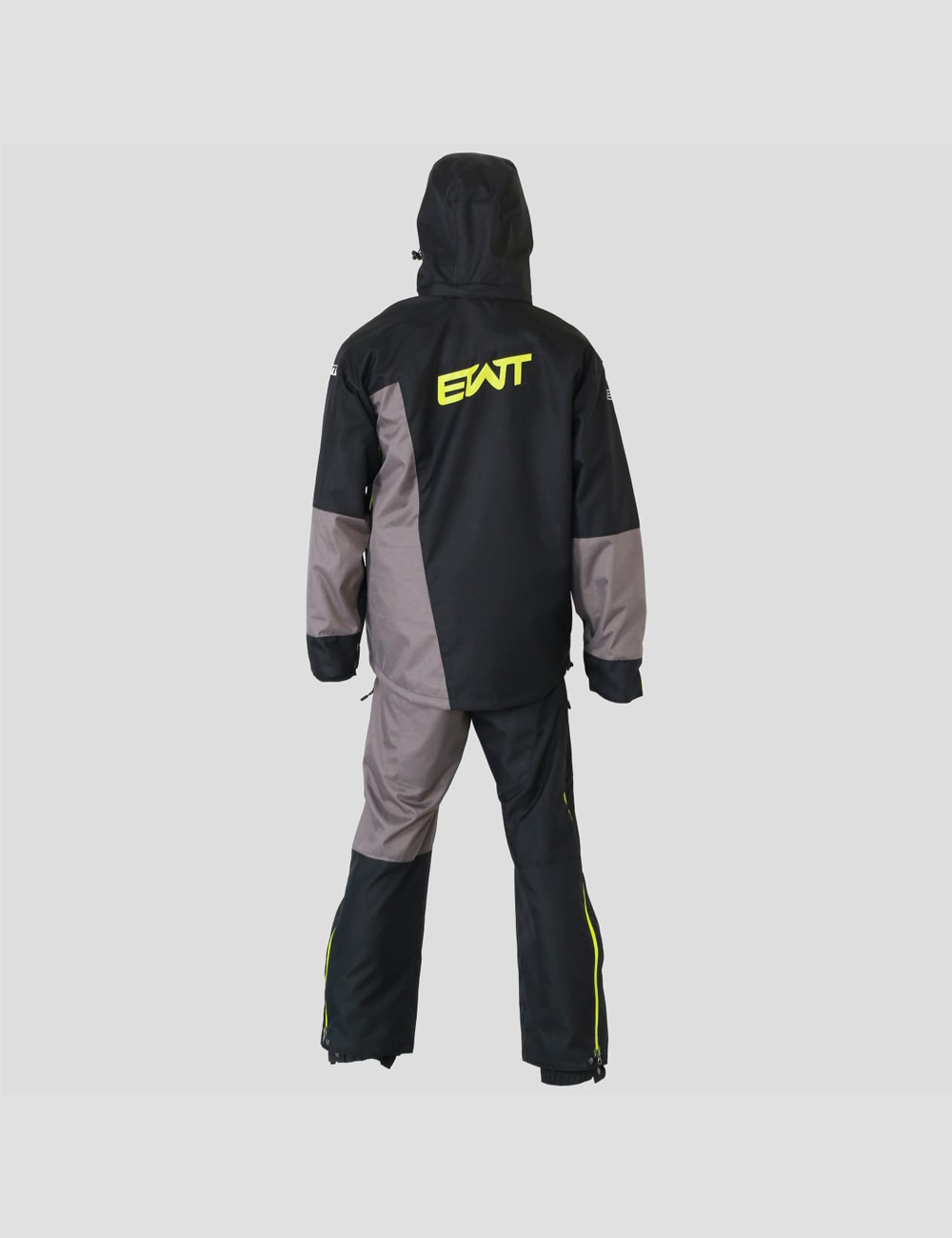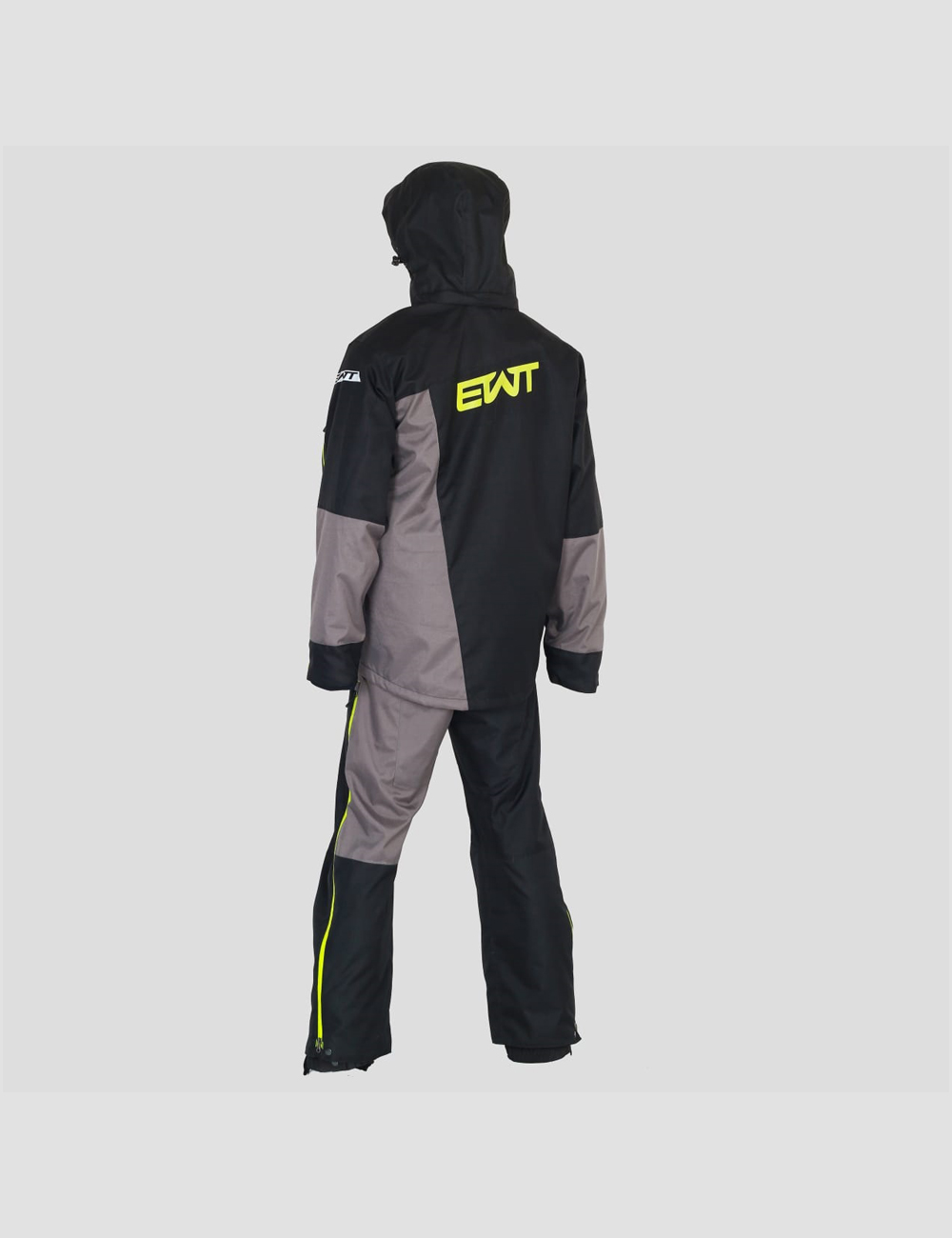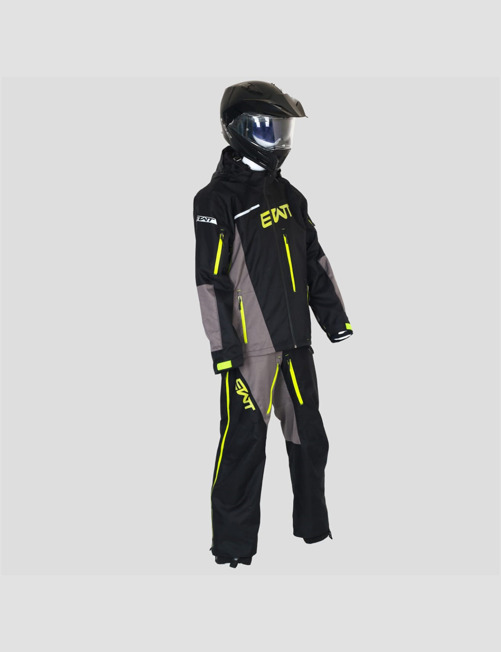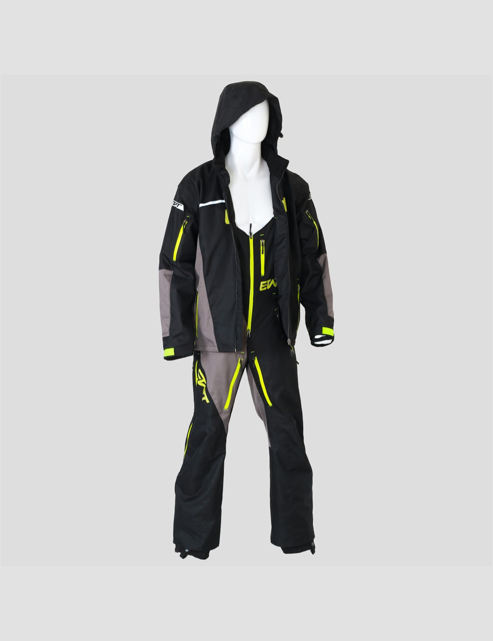 This Fortis Two Piece Suit is made from durable, three layer, 30k 30k fabric. It has a removable hood with YKK water resistant aqua guard zippers. It has air vents with Snow Frog mesh at shoulder, legs, and under arm. Cuffs are also snow proof. Pockets are located on chest, left arm, and two at the pant. This suit has snow gators at the ankle with Velcro and snaps. There is also a side adjustment with belt. All seams are sealed with a heavy duty tape. Lining is in black mesh. Colors are fully customizable and Removable Suspenders.