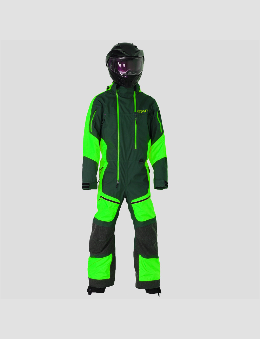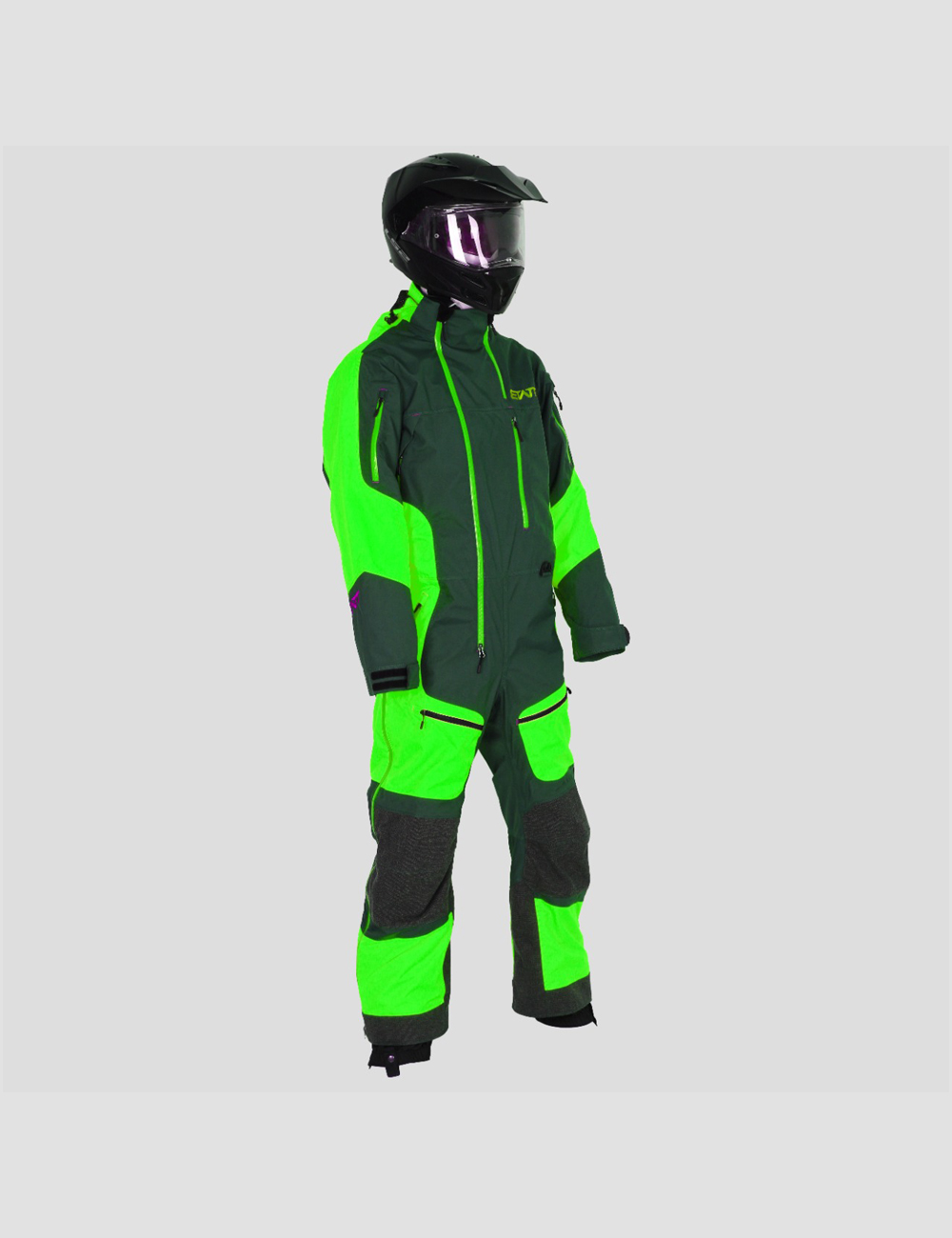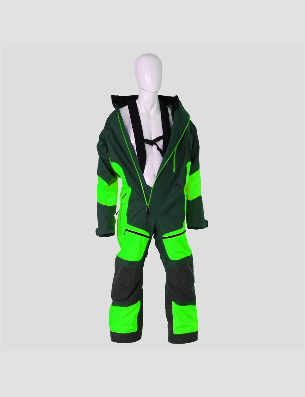 This Snowbike T2 One Piece Suit suit is made from durable, three layer, 30k 30k fabric. It has a removable hood with YKK water resistant aqua guard zippers. It has air vents with Snow Frog mesh at shoulder, legs, and under arm. Cuffs are also snow proof. Pockets are located on chest, left arm, and two at the pant. This suit has snow gators at the ankle with Velcro and snaps. There is also a side adjustment with belt. All seams are sealed with a heavy duty tape. Lining is in black mesh. Colors are fully customizable and Removable Suspenders.
